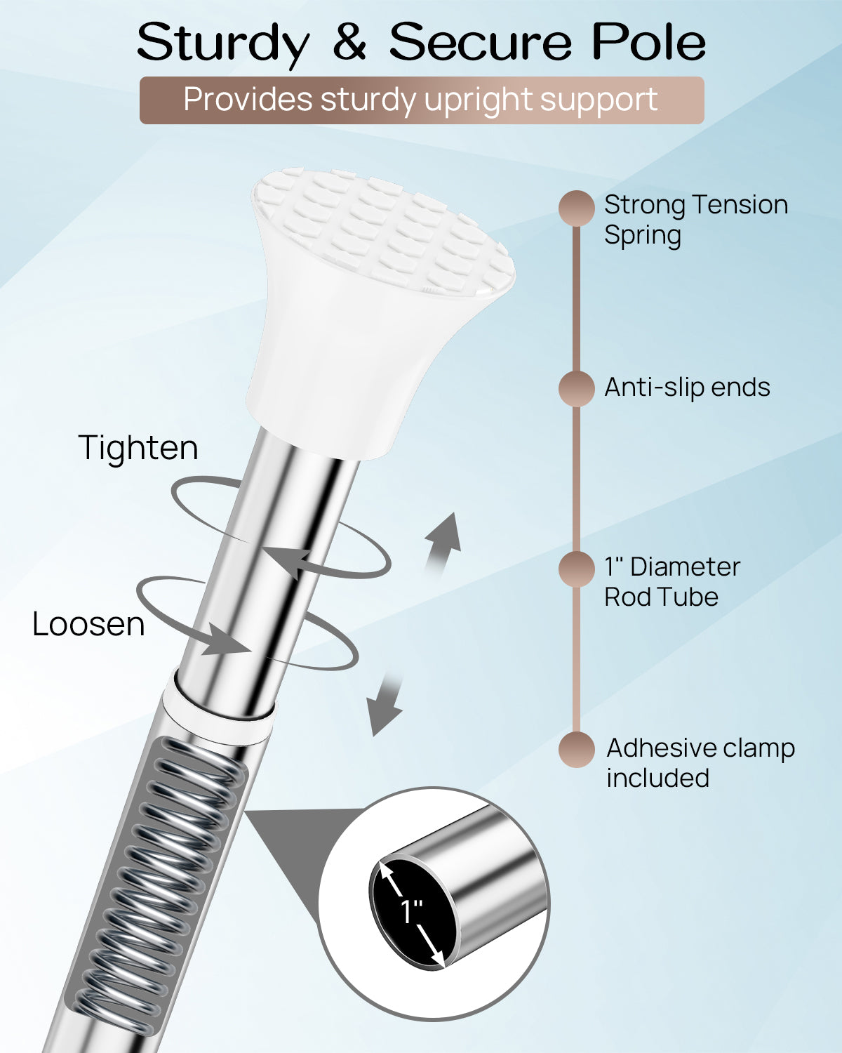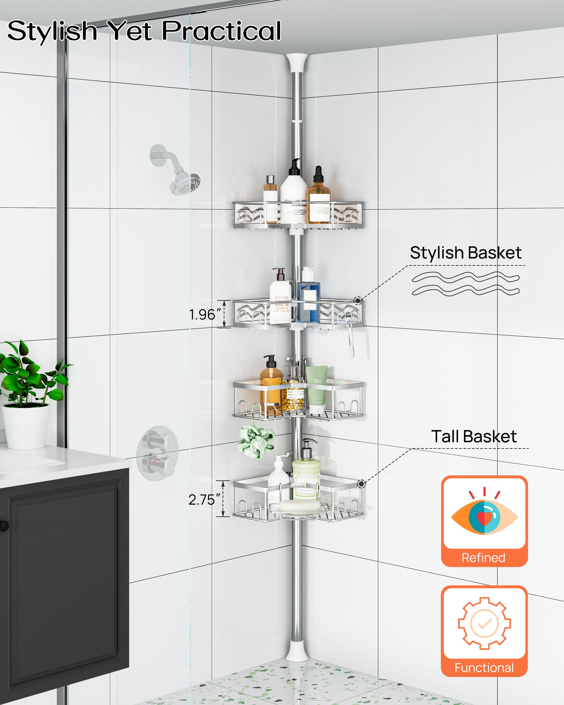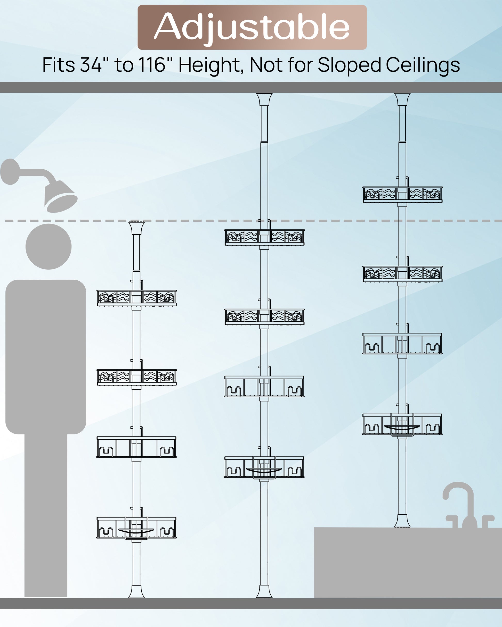 AZ16 Shower Caddy Tension Pole, Rustproof Stainless Steel Poles & 4-Tier Durable/Adjustable Shelves, Fit 34 to 116 Inch Height