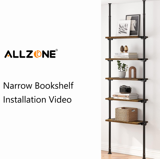 AZ07 5 Tiers Narrow Bookshelf with Adjustable Shelves, Tension Mount, Constructed of Metal Poles and Wood Shelves, Pole Fits 92 to 116 Inch Height
